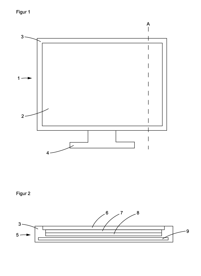 The figure 2 shows the cut (A) through the mobile computer system (4) with case (3), protective glass of the layered/stacked display (5), active display (6), reflective display (7), system board with processor, data storage, wireless cellular/mobile network module and other components (8) and the energy source/power supply (9).