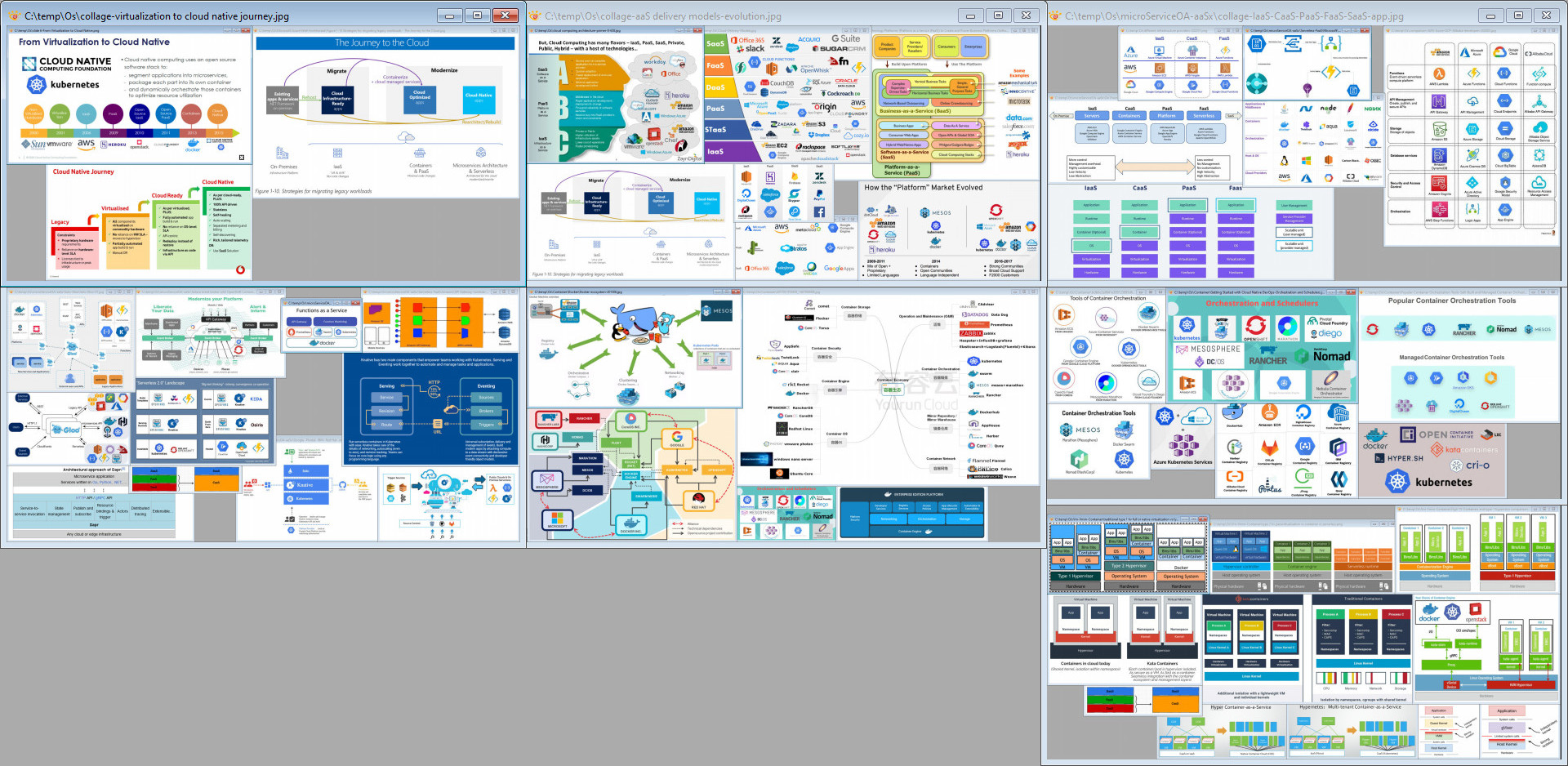 The following is a temporary collage of some of said collages focusing on the history and evolution of virtualization, container orchestration, as a Service (aaS), Cloud-native Computing (CnC), etc..