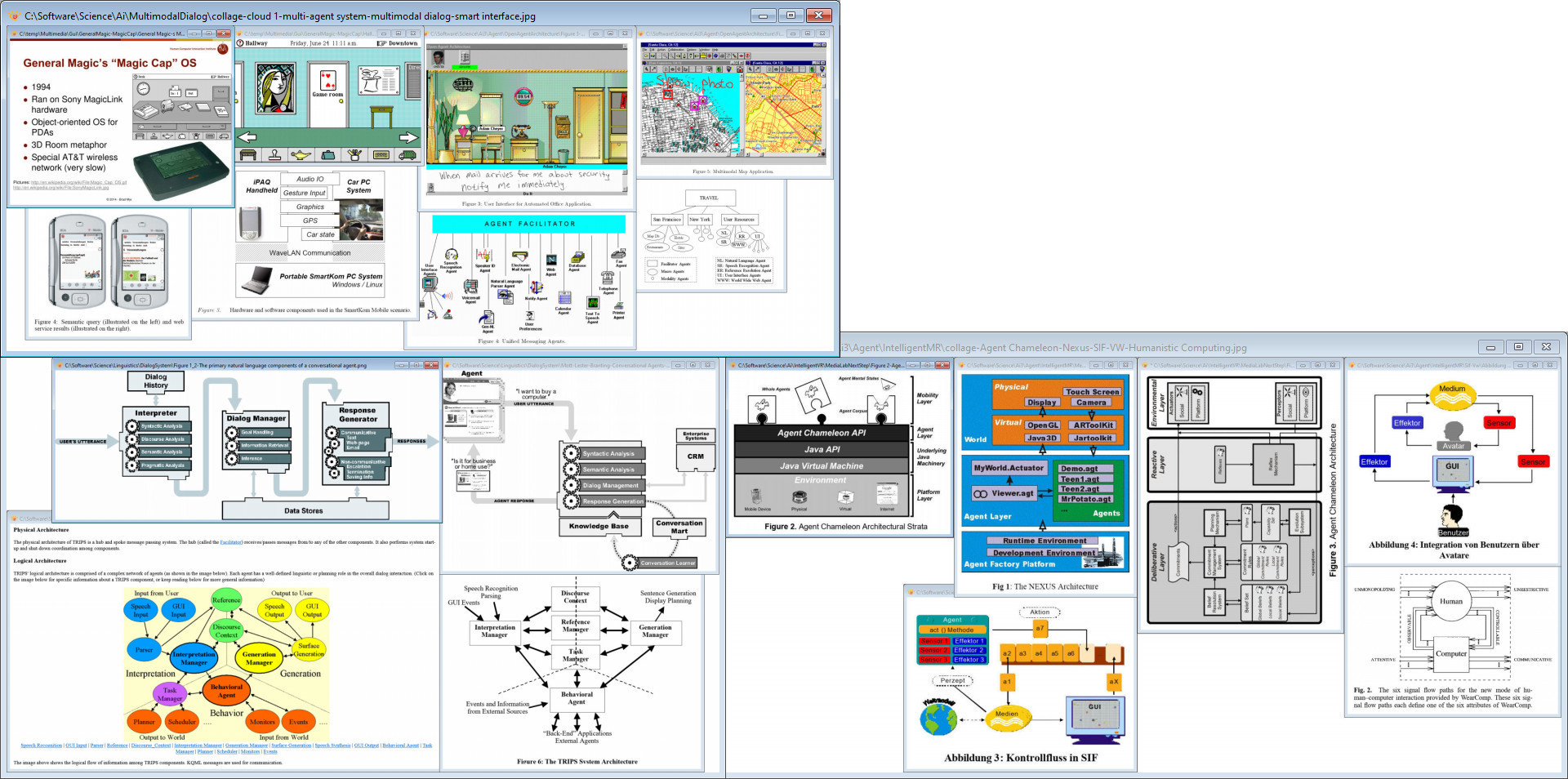 The following is a temporary collage of some of said collages with Ubiquitous Computing of the first generation (UbiC 1.0), Cloud Computing of the first generation (CC 1.0), Magic Communicating applications (Magic Cap) platform, office suite, Semantic (World Wide) Web (SWWW), Multi-Agent System (MAS), multimodal dialogue management, multi-agent dialog system, smart interface, Conversational Agent System (CAS or ConAS), Belief-Desire-Intention (BDI) agent architecture, mobile agent, social agent, Holonic Agent System (HAS), Mixed Reality (MR), Humanistic Computing (HC), Personal Digital Assistant (PDA), smartphone, smarttablet, Robotic System (RS), Ontoscope (Os), etc..